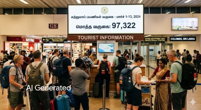 2025 ஆம் ஆண்டில் மார்ச் மாதத்தின் முதல் 13 நாட்களில் 97,322 சுற்றுலாப் பயணிகள் நாட்டுக்கு வருகை தந்துள்ளதாக இலங்கை சுற்றுலா அபிவிருத்தி அதிகார சபை தெரிவித்துள்ளது.