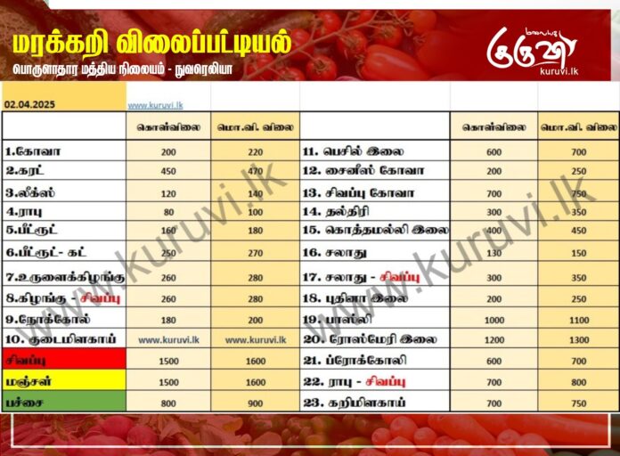 Homeஉள்நாடுமரக்கறி விலைப்பட்டியல் (02.04.2025) உள்நாடுசெய்திவணிகம் மரக்கறி விலைப்பட்டியல் (02.04.2025) By editor April 2, 2025 0 1 Share FacebookTwitterPinterestWhatsApp நுவரெலியா பொருளாதார மத்திய நிலையத்தால் இன்று (02) வெளியிடப்பட்டுள்ள மரக்கறி வகைகளின் (ஒரு கிலோ) விலை பட்டியல்… Share FacebookTwitterPinterestWhatsApp Previous articleகுறைந்த விலையில் போசாக்கான உணவு வழங்கும் புதிய திட்டம் ஆரம்பம்Next articleமியன்மாருக்கு நிவாரண குழுக்களை அனுப்புகிறது இலங்கை! RELATED ARTICLES Big Story இலங்கை நாடாளுமன்றத்தில் 08 ஆம் திகதி வியட்நாம் ஜனாதிபதி உரை! April 29, 2026 Top news ஈரான் தனித்துவிடப்படவில்லை: ரஷ்யாவுக்கு நன்றி தெரிவிப்பு! April 27, 2026 Big Story ஈரான் போருக்கும், துப்பாக்கிச்சூட்டுக்கும் தொடர்பா? விசாரணை தீவிரம்! April 26, 2026 LEAVE A REPLY Cancel reply Comment: Please enter your comment! Name:* Please enter your name here Email:* You have entered an incorrect email address! Please enter your email address here Website: Save my name, email, and website in this browser for the next time I comment. Most Popular இலங்கை நாடாளுமன்றத்தில் 08 ஆம் திகதி வியட்நாம் ஜனாதிபதி உரை! April 29, 2026 ஈரான் தனித்துவிடப்படவில்லை: ரஷ்யாவுக்கு நன்றி தெரிவிப்பு! April 27, 2026 ஈரான் போருக்கும், துப்பாக்கிச்சூட்டுக்கும் தொடர்பா? விசாரணை தீவிரம்! April 26, 2026 இஸ்ரேல், லெபனானுக்கிடையிலான போர் நிறுத்தம் மேலும் நீட்டிப்பு! April 24, 2026 Load more