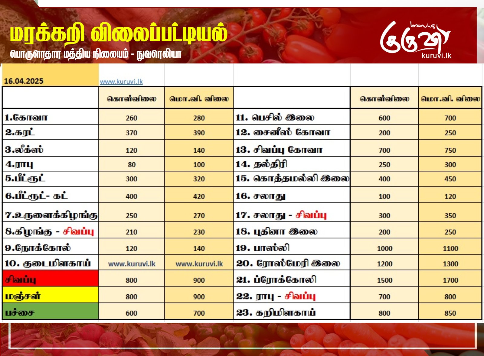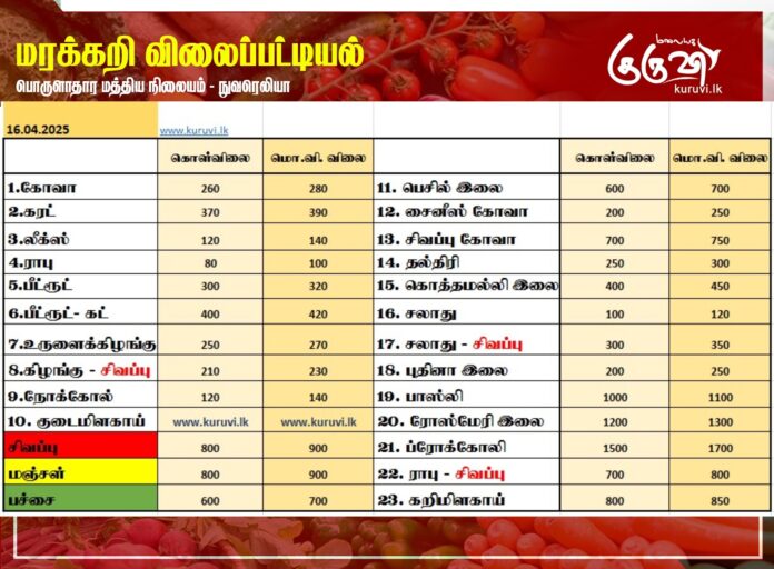 Homeஉள்நாடுமரக்கறி விலைப்பட்டியல் (16.04.2025) உள்நாடுசெய்திவணிகம் மரக்கறி விலைப்பட்டியல் (16.04.2025) By editor April 16, 2025 0 1 Share FacebookTwitterPinterestWhatsApp நுவரெலியா பொருளாதார மத்திய நிலையத்தால் இன்று (16) வெளியிடப்பட்டுள்ள மரக்கறி வகைகளின் (ஒரு கிலோ) விலை பட்டியல்… Share FacebookTwitterPinterestWhatsApp Previous articleஅதிவேக நெடுஞ்சாலை: 4 நாட்களுக்குள் 17 கோடி ரூபாவை தாண்டியது வருமானம்!Next articleபோதைப்பொருட்கள், கத்திகளுடன் பிபிலையில் இளைஞன் கைது! RELATED ARTICLES Big Story இலங்கை நாடாளுமன்றத்தில் 08 ஆம் திகதி வியட்நாம் ஜனாதிபதி உரை! April 29, 2026 Top news ஈரான் தனித்துவிடப்படவில்லை: ரஷ்யாவுக்கு நன்றி தெரிவிப்பு! April 27, 2026 Big Story ஈரான் போருக்கும், துப்பாக்கிச்சூட்டுக்கும் தொடர்பா? விசாரணை தீவிரம்! April 26, 2026 LEAVE A REPLY Cancel reply Comment: Please enter your comment! Name:* Please enter your name here Email:* You have entered an incorrect email address! Please enter your email address here Website: Save my name, email, and website in this browser for the next time I comment. Most Popular இலங்கை நாடாளுமன்றத்தில் 08 ஆம் திகதி வியட்நாம் ஜனாதிபதி உரை! April 29, 2026 ஈரான் தனித்துவிடப்படவில்லை: ரஷ்யாவுக்கு நன்றி தெரிவிப்பு! April 27, 2026 ஈரான் போருக்கும், துப்பாக்கிச்சூட்டுக்கும் தொடர்பா? விசாரணை தீவிரம்! April 26, 2026 இஸ்ரேல், லெபனானுக்கிடையிலான போர் நிறுத்தம் மேலும் நீட்டிப்பு! April 24, 2026 Load more