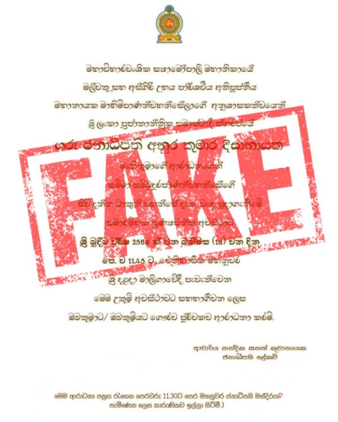 ஜனாதிபதியின் செயலாளர் கலாநிதி நந்திக சனத் குமாநாயக்கவின் பெயரில் போலியாக தயாரிக்கப்பட்ட இந்த அழைப்பிதழில் “சிறி தலதா வழிபாடு” ஆரம்ப நிகழ்வில் பங்கேற்க கண்டியில் உள்ள ஜனாதிபதி மாளிகைக்கு வருகை தருமாறு அதில் குறிப்பிடப்பட்டுள்ளது.