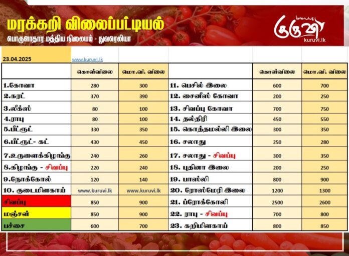Homeஉள்நாடுமரக்கறி விலைப்பட்டியல் (23.04.2025) உள்நாடுசெய்திவணிகம் மரக்கறி விலைப்பட்டியல் (23.04.2025) By editor April 23, 2025 0 1 Share FacebookTwitterPinterestWhatsApp நுவரெலியா பொருளாதார மத்திய நிலையத்தால் இன்று (23) வெளியிடப்பட்டுள்ள மரக்கறி வகைகளின் (ஒரு கிலோ) விலை பட்டியல்… Share FacebookTwitterPinterestWhatsApp Previous articleகாஷ்மீர் தாக்குதல்: உலக தலைவர்கள் கடும் கண்டனம்!Next articleகருணா, பிள்ளையானுக்கு அரசியலில் பதவிகள் வழங்கப்பட்டமை தவறு! RELATED ARTICLES Big Story இலங்கை நாடாளுமன்றத்தில் 08 ஆம் திகதி வியட்நாம் ஜனாதிபதி உரை! April 29, 2026 Top news ஈரான் தனித்துவிடப்படவில்லை: ரஷ்யாவுக்கு நன்றி தெரிவிப்பு! April 27, 2026 Big Story ஈரான் போருக்கும், துப்பாக்கிச்சூட்டுக்கும் தொடர்பா? விசாரணை தீவிரம்! April 26, 2026 LEAVE A REPLY Cancel reply Comment: Please enter your comment! Name:* Please enter your name here Email:* You have entered an incorrect email address! Please enter your email address here Website: Save my name, email, and website in this browser for the next time I comment. Most Popular இலங்கை நாடாளுமன்றத்தில் 08 ஆம் திகதி வியட்நாம் ஜனாதிபதி உரை! April 29, 2026 ஈரான் தனித்துவிடப்படவில்லை: ரஷ்யாவுக்கு நன்றி தெரிவிப்பு! April 27, 2026 ஈரான் போருக்கும், துப்பாக்கிச்சூட்டுக்கும் தொடர்பா? விசாரணை தீவிரம்! April 26, 2026 இஸ்ரேல், லெபனானுக்கிடையிலான போர் நிறுத்தம் மேலும் நீட்டிப்பு! April 24, 2026 Load more