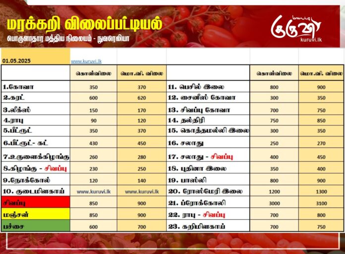 Homeஉள்நாடுமரக்கறி விலைப்பட்டியல் (01.05.2025) உள்நாடுசெய்திவணிகம் மரக்கறி விலைப்பட்டியல் (01.05.2025) By editor May 1, 2025 0 1 Share FacebookTwitterPinterestWhatsApp நுவரெலியா பொருளாதார மத்திய நிலையத்தால் இன்று (01) வெளியிடப்பட்டுள்ள மரக்கறி வகைகளின் (ஒரு கிலோ) விலை பட்டியல்… Share FacebookTwitterPinterestWhatsApp Previous articleதோட்டத் தொழிலாளர்களின் உரிமைகள் உறுதிப்படுத்தப்படும்!Next articleதோட்டத் தொழிலாளர்கள் தலைநிமிர்ந்து வாழக்கூடிய சூழலை நிச்சயம் உருவாக்குவோம் RELATED ARTICLES Big Story இலங்கை நாடாளுமன்றத்தில் 08 ஆம் திகதி வியட்நாம் ஜனாதிபதி உரை! April 29, 2026 Top news ஈரான் தனித்துவிடப்படவில்லை: ரஷ்யாவுக்கு நன்றி தெரிவிப்பு! April 27, 2026 Big Story ஈரான் போருக்கும், துப்பாக்கிச்சூட்டுக்கும் தொடர்பா? விசாரணை தீவிரம்! April 26, 2026 LEAVE A REPLY Cancel reply Comment: Please enter your comment! Name:* Please enter your name here Email:* You have entered an incorrect email address! Please enter your email address here Website: Save my name, email, and website in this browser for the next time I comment. Most Popular இலங்கை நாடாளுமன்றத்தில் 08 ஆம் திகதி வியட்நாம் ஜனாதிபதி உரை! April 29, 2026 ஈரான் தனித்துவிடப்படவில்லை: ரஷ்யாவுக்கு நன்றி தெரிவிப்பு! April 27, 2026 ஈரான் போருக்கும், துப்பாக்கிச்சூட்டுக்கும் தொடர்பா? விசாரணை தீவிரம்! April 26, 2026 இஸ்ரேல், லெபனானுக்கிடையிலான போர் நிறுத்தம் மேலும் நீட்டிப்பு! April 24, 2026 Load more